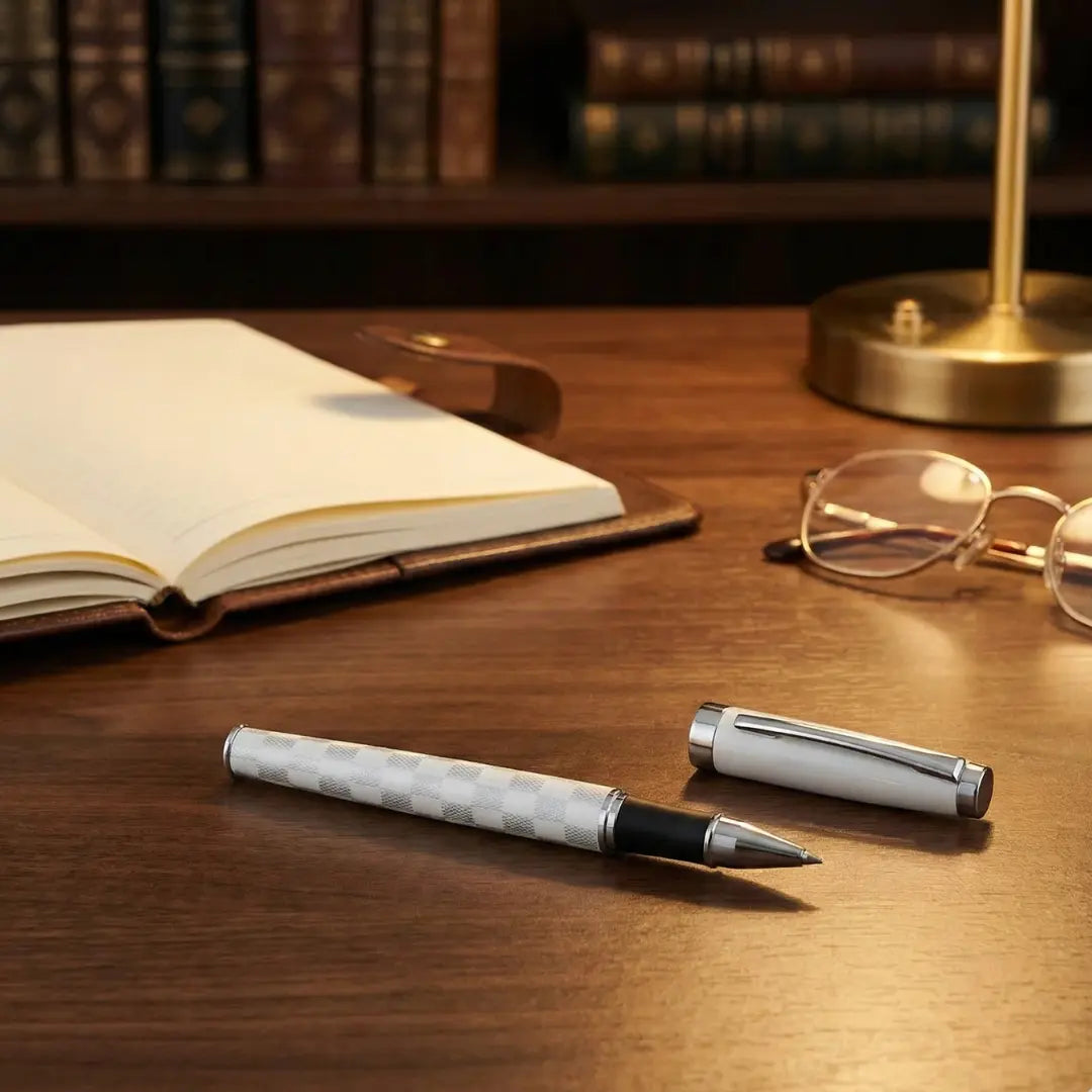Picasso Parri Checkers White Roller Pen | Premium Customised Refillable Roller Ball Pen