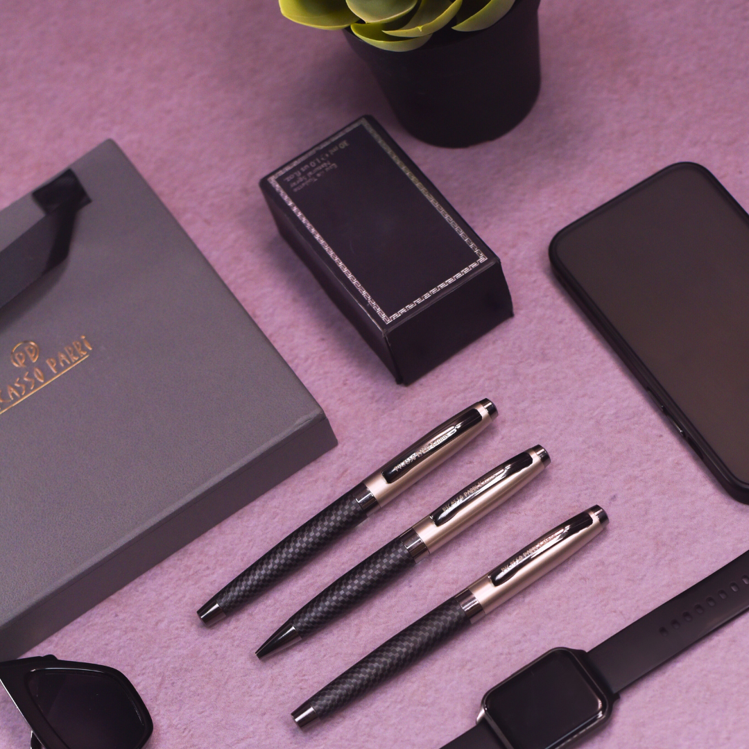 Upgrade your writing experience with the Picasso Parri Kainos Pen Set, a luxurious combination of a roller pen, fountain pen, and ball pen : crafted for versatility, sophistication, and style. Designed for professionals, executives, and pen enthusiasts, this premium pen gift set brings together performance and elegance in one refined collection.